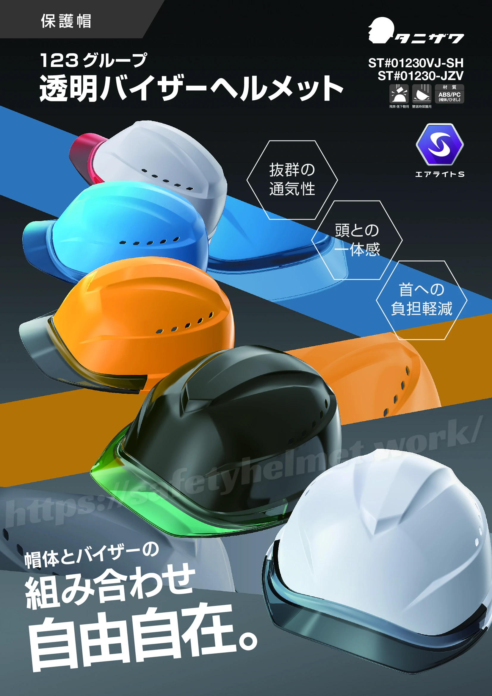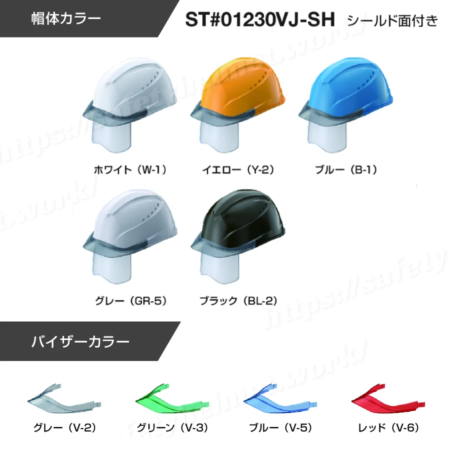 『ST#01230VJ-SH』は、帽体がABS樹脂製/バイザー・シールドがPC樹脂製の工事用ヘルメットです。