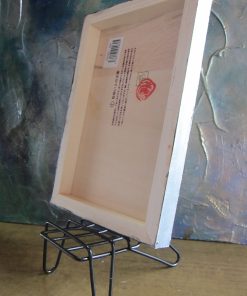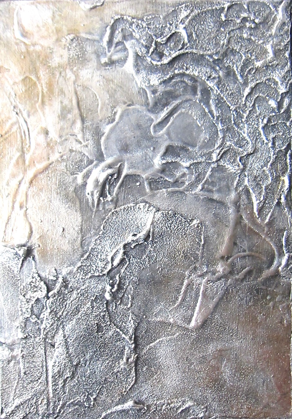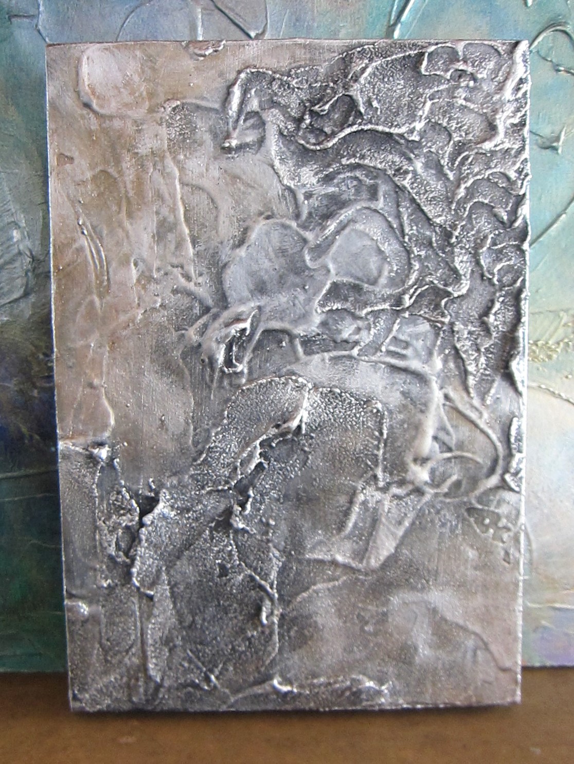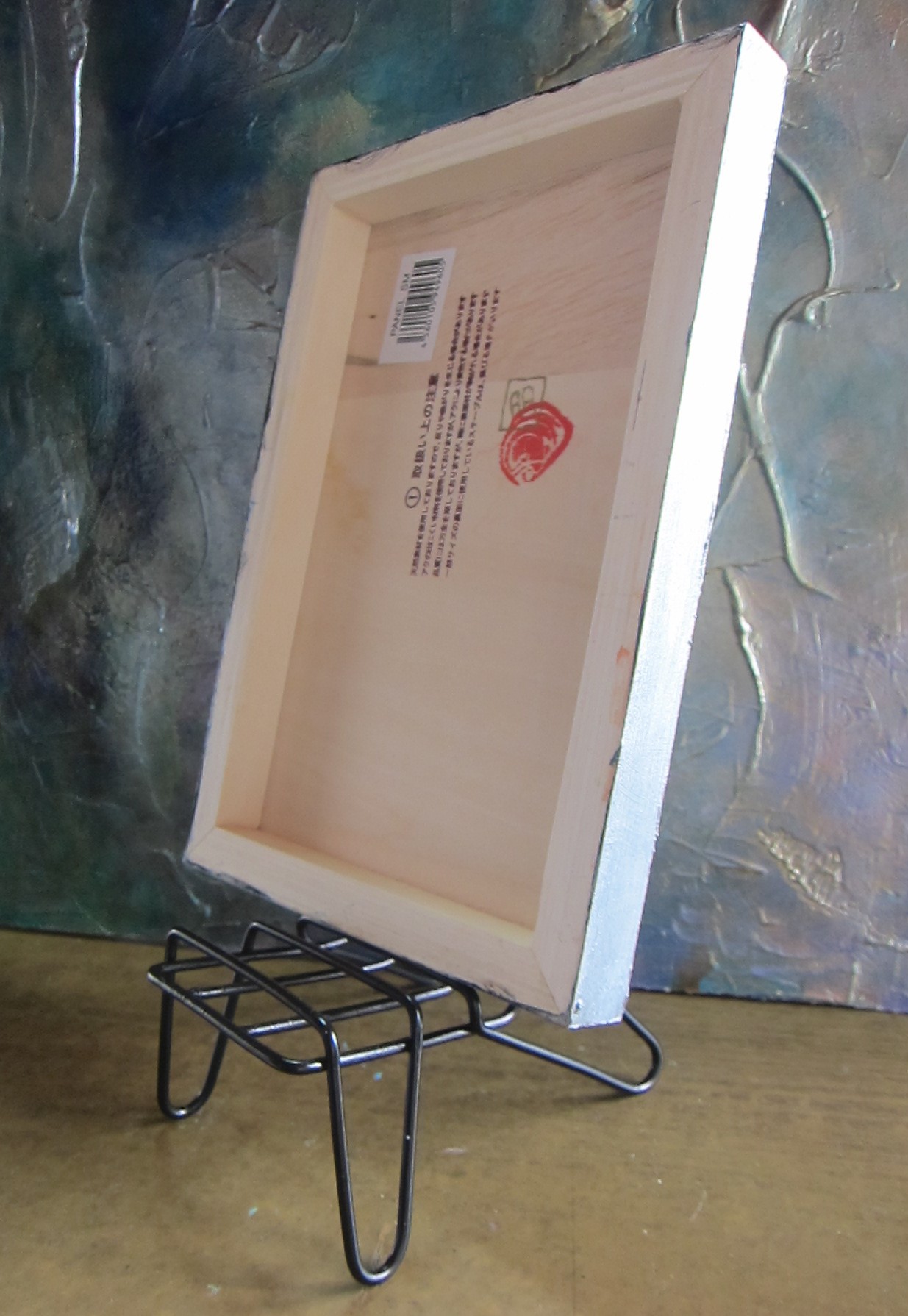 SMサイズのパネルを使用してモデリングペーストと木工ボンドで盛り上げ部を作成しアクリル絵の具で仕上げてあります。アクリル絵画なのですが、実物を手に取りますと溶けだした銀に見えて金属で製作されたように感じられます。重みを感じさせて普通の絵画とはことなった金属の飾りのように見えます。スタンドは付属しませんが、そのまま飾ってもらっても良いですしSMサイズ用のキャンバス用額縁を使用すれば重厚な装飾と見えるようになります。