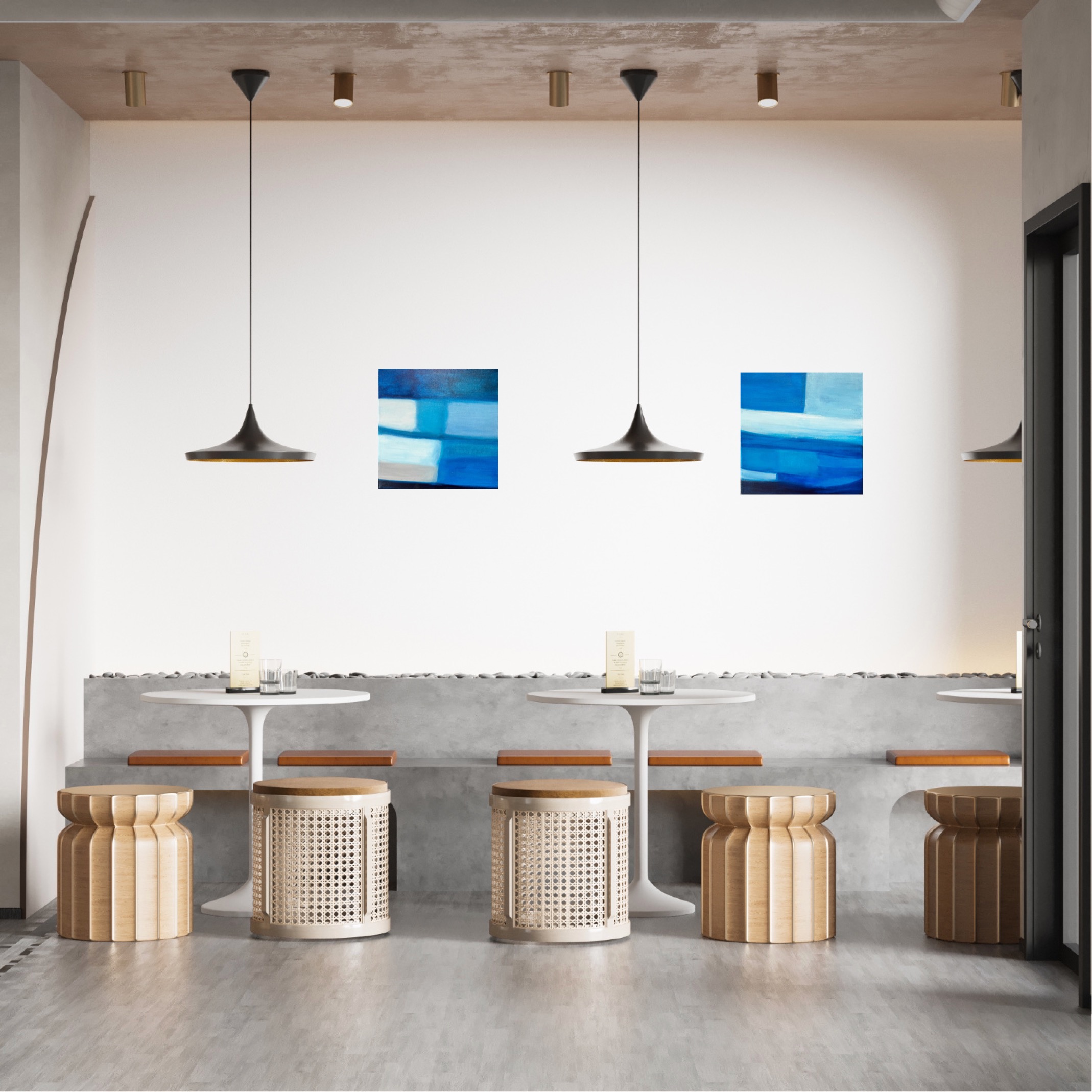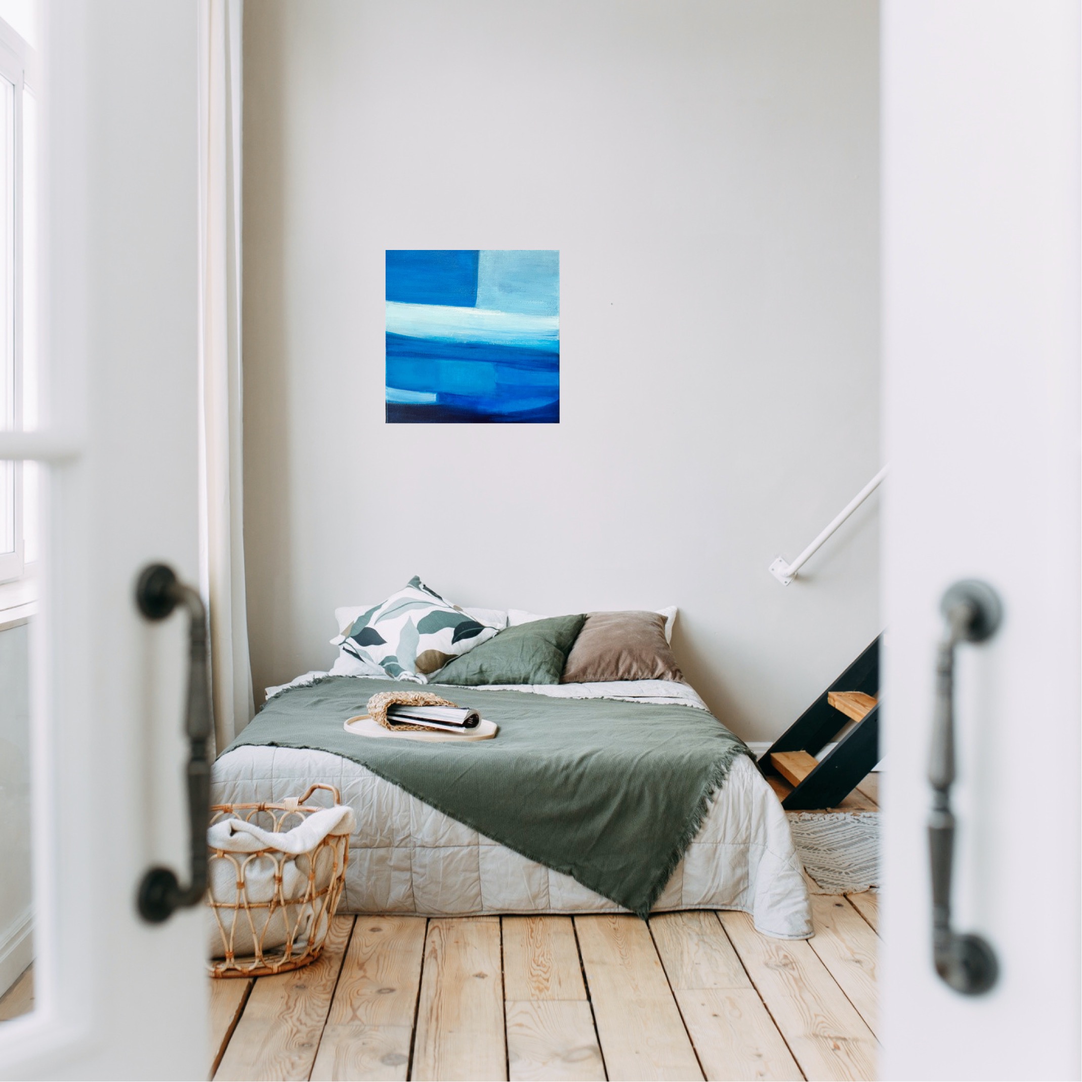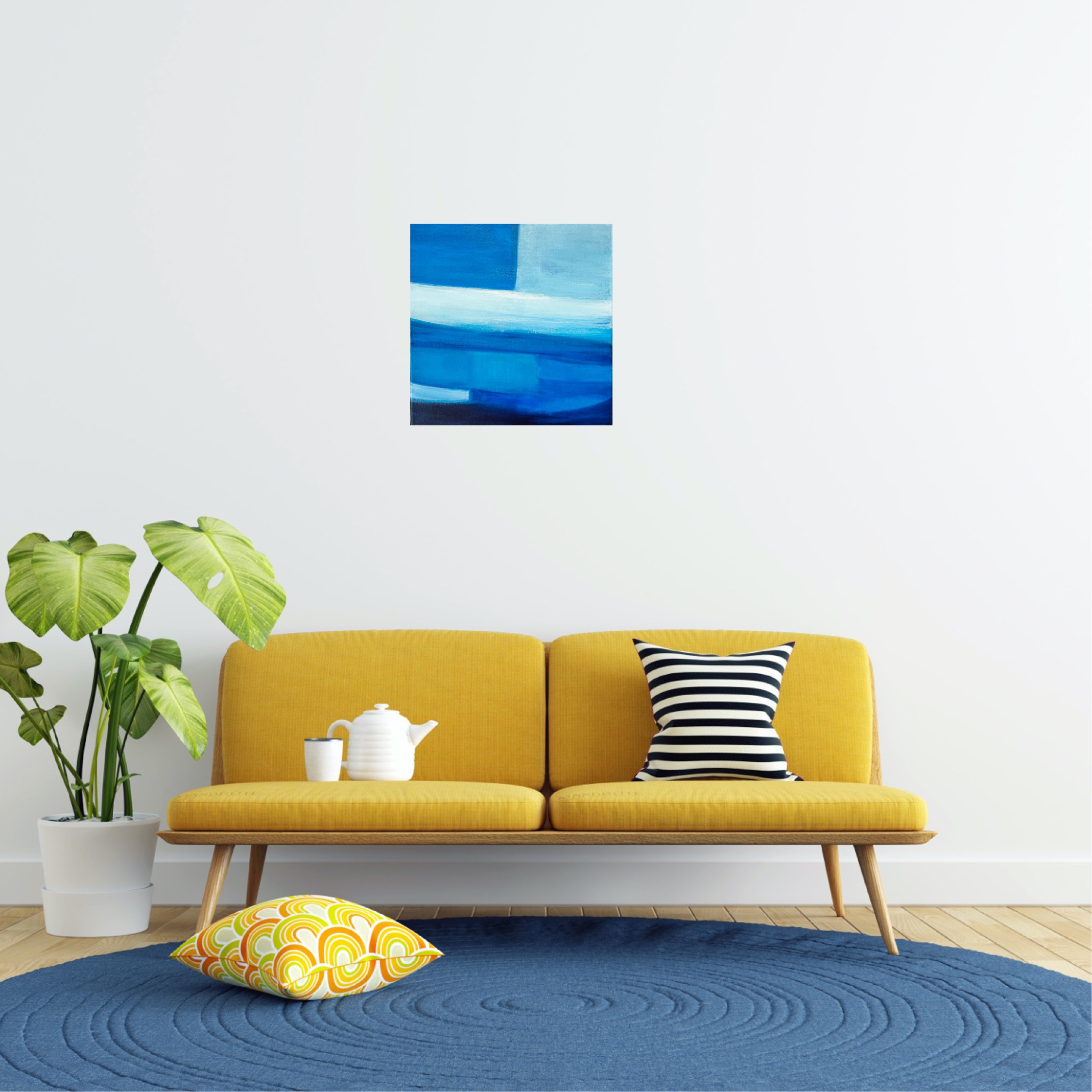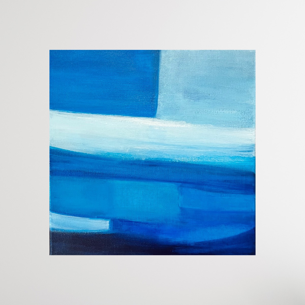 青を題材にした抽象画作品シリーズです。木のインテリアと相性の良い、鮮やかながらも落ち着いた青を配色しています。空間のアクセントになる作品です。
